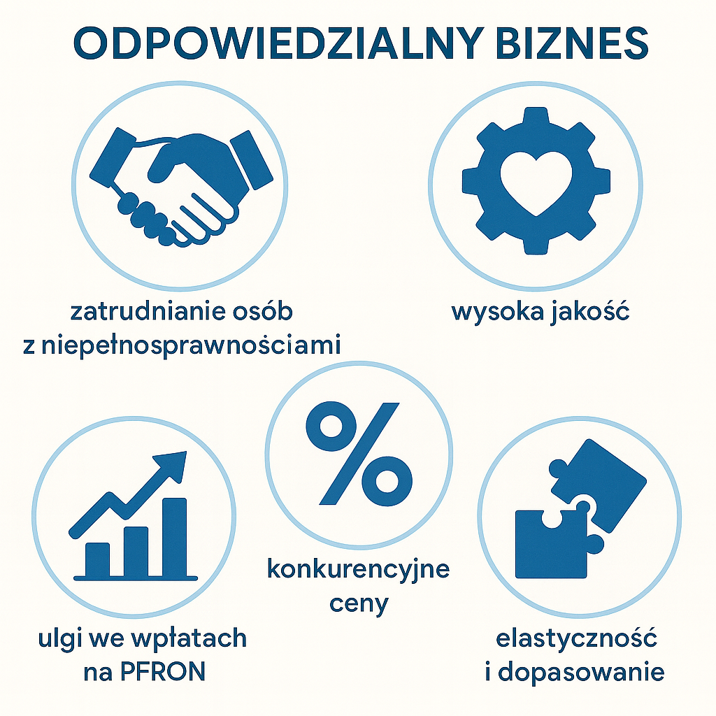 „Od początku naszej działalności kierujemy się zasadą odpowiedzialnego biznesu. Zatrudniając osoby z niepełnosprawnościami, nie tylko tworzymy stabilne i wartościowe miejsca pracy, ale także zapewniamy naszym klientom realne korzyści finansowe w postaci ulg we wpłatach na PFRON. Dzięki refundacji części wynagrodzeń możemy oferować wyjątkowo konkurencyjne ceny, nie rezygnując przy tym z najwyższej jakości świadczonych usług. Naszym priorytetem jest elastyczność i pełne dopasowanie do potrzeb każdego klienta, aby współpraca była zarówno efektywna, jak i korzystna dla obu stron.”